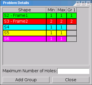 Let's first see how piece groups are defined using this window. Although the above section may sound complicated, implementing piece groups is actually very simple. All actions take place in the Problem Details Editor. Initially the Group Editor shows a tabulated overview of the pieces used in the problem. The first column (Shape) lists the pieces by their prefix and name, the second and third (min and max) show the instances range of each.